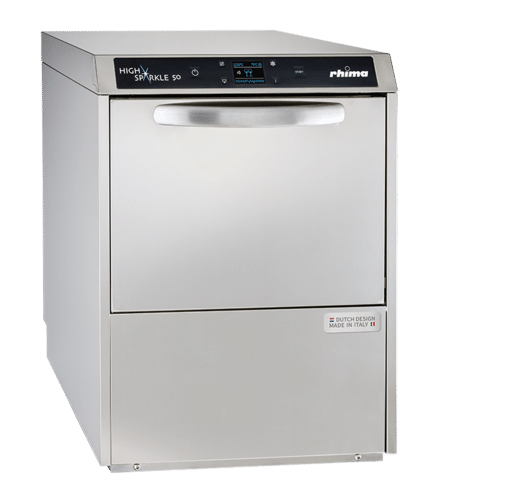 De High Sparkle 50 is een krachtige glazenspoelmachine met een doorvoerhoogte van 380 mm. Dit model beschikt over een ruime korf van 500×500 mm en is uitgerust met 8 programma’s, doseerapparaten en breaktank.